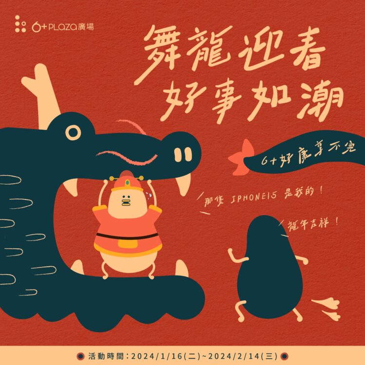 從1月15日至2月14日期間,6+PLAZA商場將展開春節滿額抽獎活動,只要在商場館內單筆消費滿1,399元,並在商場的粉專貼文下分享與龍有關的文字,按讚、留言,再透過表單連結填入發票號碼,即有機會抽中最新的IPHONE 15、融蠟燈、氣壓眼罩按摩儀,好禮直接帶回家,豐富的互動體驗為顧客的新春購物增添一份濃厚的歡樂。