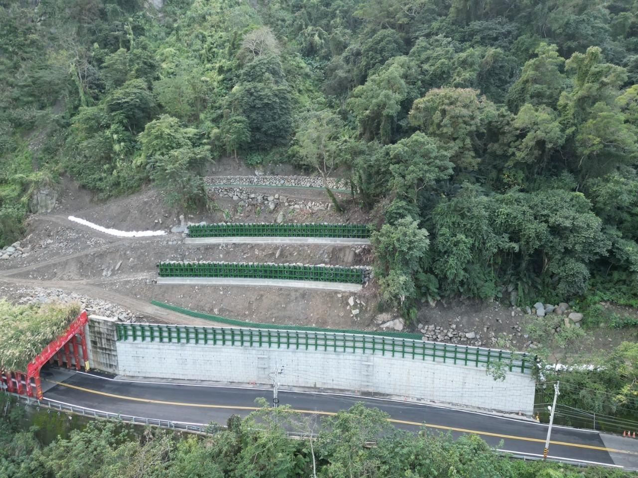 24.6K處新建「防落石柵欄」,延續前期工程以弧形景觀鋼構方式辦理,不僅施工快速,且在結構安全之下,更兼顧生態環境與景觀概念;28.5K處明隧道旁常有巨石掉落路面,但因腹地不足,設計團隊以現地取材方式,設置4道階梯式消能設施;39.8K處上邊坡設置自由樑護坡及下邊坡擋土設施,保有邊坡生態復育,且順勢增加道路路幅,已保障道路行車安全且能提升竹東及五峰鄉產業及觀光發展。