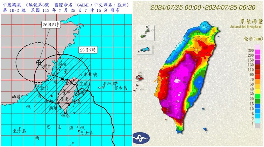 凱米颱風25日零時從宜蘭南澳登陸,凌晨4時20分從桃園新屋出海,早上7時的中心位置在北緯25.1度、東經120.5度,亦即在新竹西北西方約60公里處,以每小時12轉16公里速度,向西北西轉西北進行,強度雖已減弱為中度颱風,但對臺灣各地及澎湖、金門、馬祖仍構成威脅。