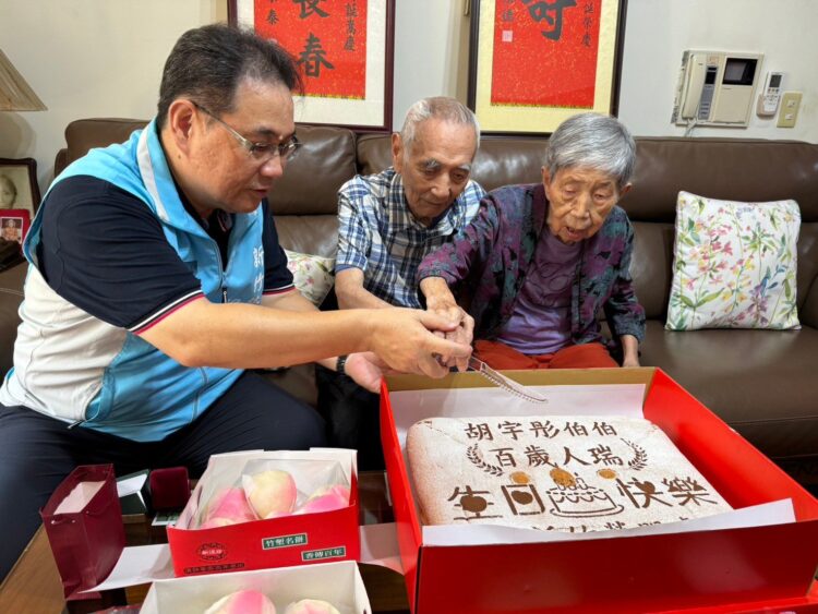 新竹榮民服務處為百歲生日榮民胡宇彤爺爺歡度100歲壽誕,該處鞠宗顯處長與北區後備軍人輔導中心主任周俊偉、湳中里里長黃彥翔、榮欣志工等一行人,隆重辦理百歲慶祝活動,榮服處除代為致贈總統及行政院長百歲壽屏,更代表輔導會獻上精心訂製金戒指及客製化百歲蛋糕、壽桃及壽麵等賀禮,祝福胡爺爺福壽康寧。