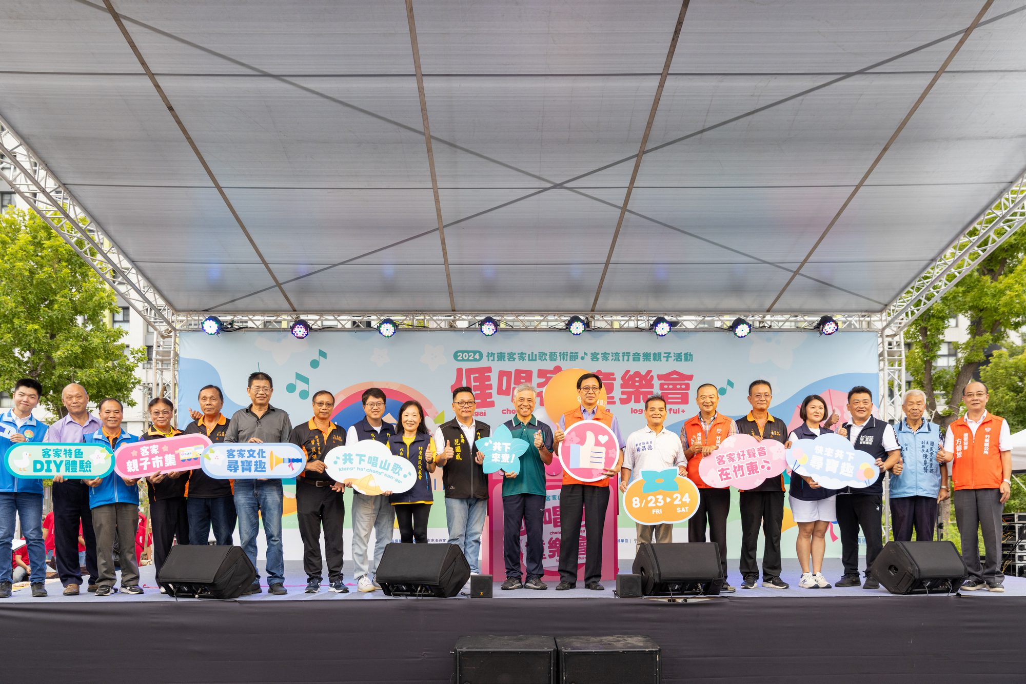 新竹縣竹東鎮公所24日在二重里公5公園,舉辦「客家流行音樂親子活動-亻厓唱客童樂會」活動,特別邀請到天王級的客家歌手陳永淘等歌手來演唱,現場還安排有山歌文化尋寶趣、一起童樂捐發票、街頭藝人表演以及客家親子市集,讓來參加的家長和小朋友開心度過一個愉快的週末假日。