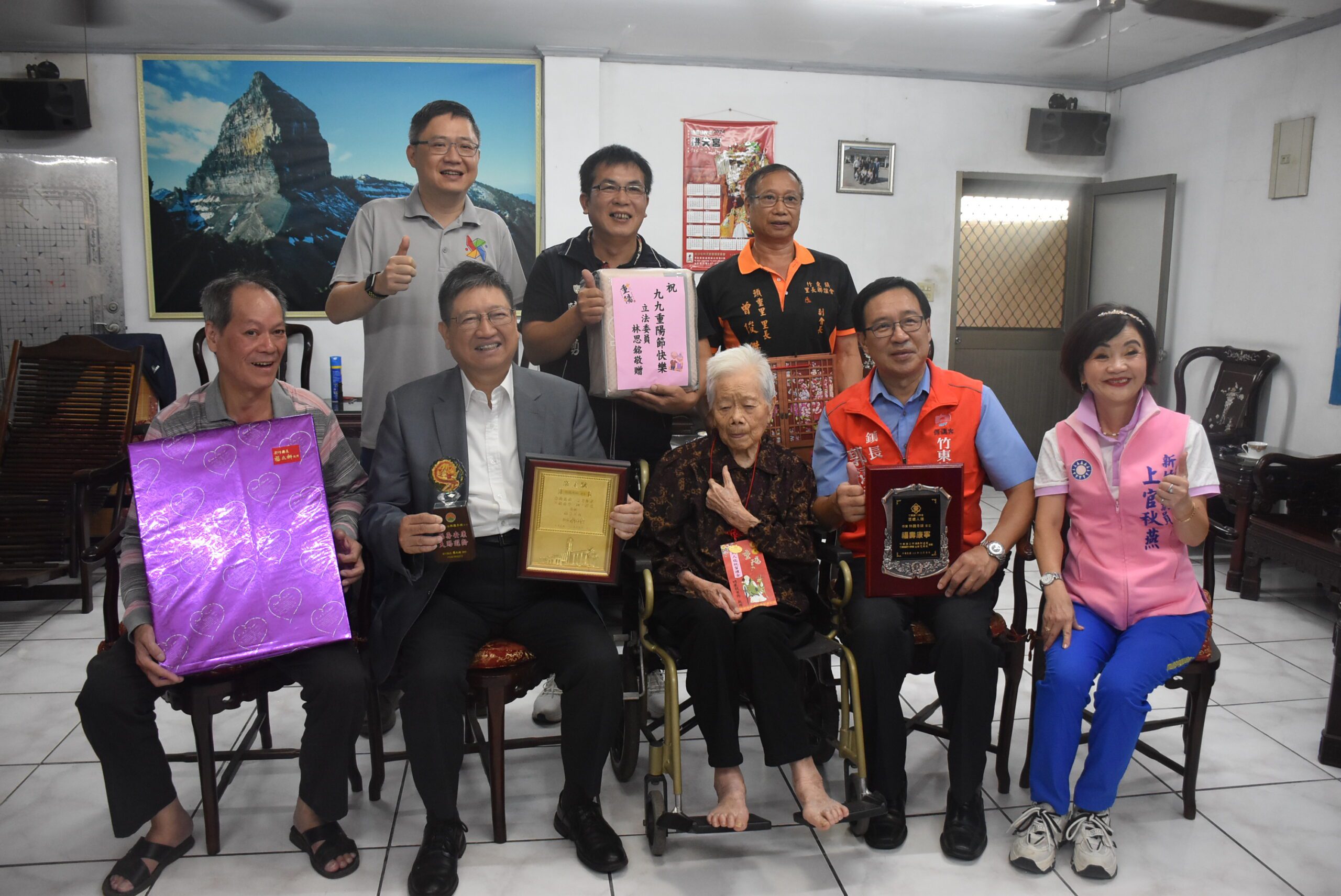 新竹縣竹東鎮長郭遠彰上週代表鎮公所團隊,在重陽節前夕,前往9位百歲人瑞、16對鑽石婚夫妻家中拜訪,並致贈禮金、匾額、賀禮,祝他們重陽節快樂。