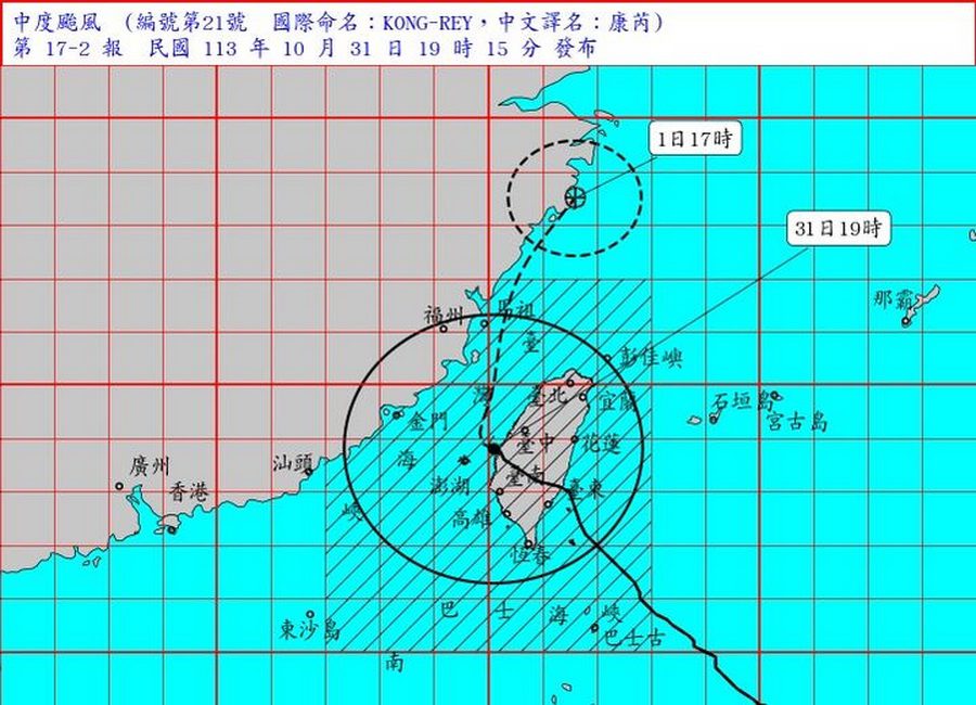 據31日晚間19時的最新資料顯示,康芮警戒區域─陸上:臺灣各地區及澎湖、金門、馬祖應嚴加戒備,並防強風豪雨。海上:臺灣附近各海面、巴士海峽及東沙島海面航行及作業船隻應嚴加戒備。