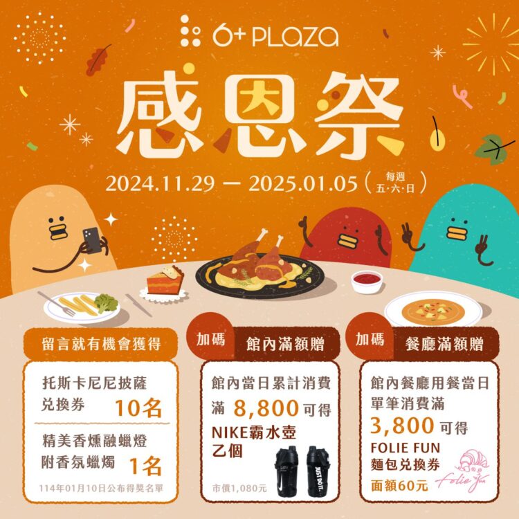 這些精彩的活動旨在豐富的感恩節體驗,讓您在購物之餘也能享受多元的娛樂與文化氛圍,留下難忘的回憶。相關的活動消息請上暐順 6+ PLAZA粉絲專頁:https://www.facebook.com/6PLAZA