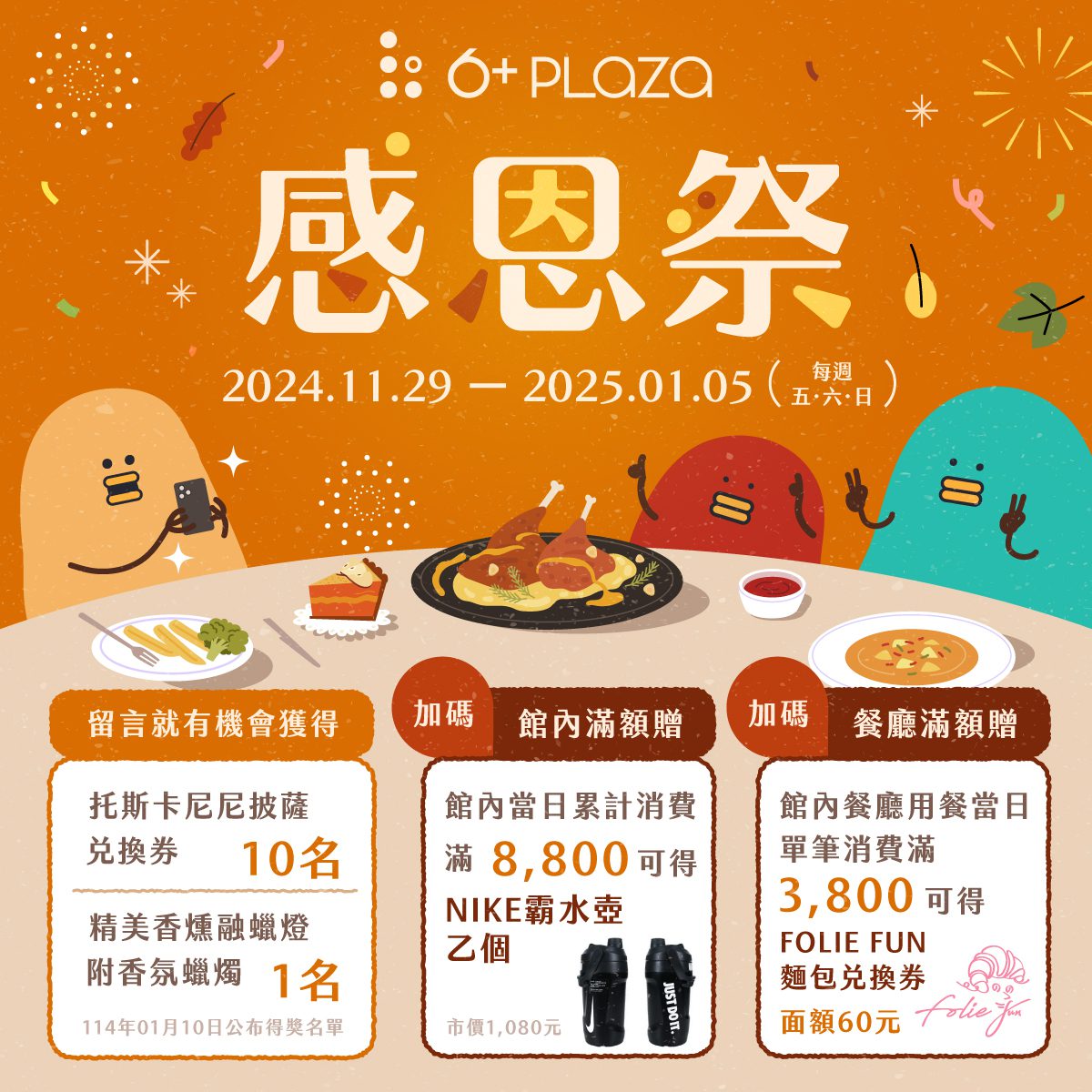 為了表達對顧客們的誠摯謝意,6+PLAZA在感恩節活動期間,推出特別的滿額禮活動,全館消費滿8,800元即送NIKE霸水壺,在餐廳單筆消費滿3,800元,即送Folie fun麵包兌換券,數量有限送完為止!鼓勵顧客邀請家人們一起聚餐,度過美好的相聚時光,抓住機會盡情傾訴、凝聚情感。