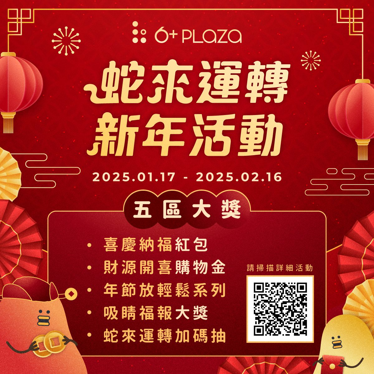 隨著農曆新年的腳步逐漸逼近,新竹縣竹北6+PLAZA商場位於新竹高鐵及六家車站對面,成為新竹的重要交通要道。為了迎接新春,商場特別準備了一系列精彩活動,讓顧客在購物的同時收穫驚喜!從1月17日至2月16日,商場將化身為新春的歡樂天地,除了享受喜慶時光,還有喜慶納福紅包、財源開喜購物金、年節放輕鬆系列、福報PS5大獎及蛇來運轉加碼抽NIKE系列好禮的機會,讓您樂享其中。
