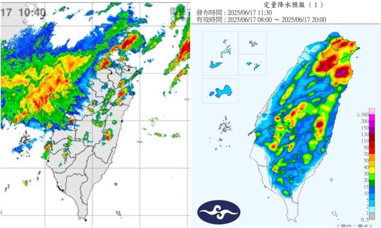 根據中央氣象署發布的訊息,6月17日因對流雲系發展旺盛,易有短延時強降雨,中部以北、宜蘭、花蓮地區及南部、臺東山區有局部大雨發生的機率,請注意雷擊及強陣風,山區慎防坍方、落石及溪水暴漲,低窪地區慎防積水。
