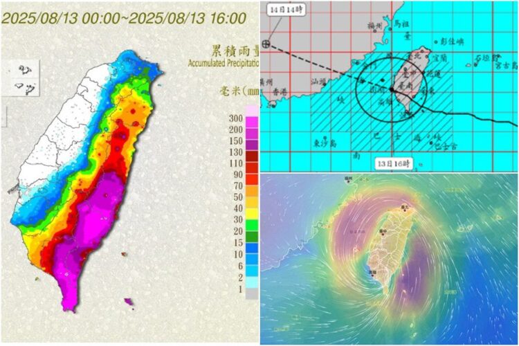 因颱風及其外圍環流影響,易有短延時強降雨,13日下午起至晚間,嘉義以南地區降雨將逐漸增加。臺東地區、花蓮山區、高雄山區、屏東山區及恆春半島有局部豪雨或大豪雨;花蓮、嘉義、臺南、高雄、屏東等地區及宜蘭山區有局部大雨或豪雨;臺中、彰化、南投、雲林、嘉義、宜蘭地區,以及苗栗以北山區和澎湖有局部大雨發生的機率。大豪雨地區:高雄市、屏東縣、花蓮縣、臺東縣。
