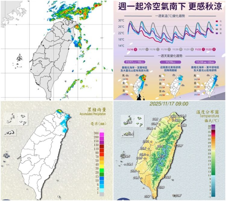 今天11月17日東北季風增強,各地天氣轉涼,明天亦受東北季風影響,中部以北、東北部及東部天氣明顯偏涼,其他地區早晚亦涼;今、明兩天基隆北海岸、東北部地區及大臺北山區有雨,並有局部大雨發生的機率,桃園以北地區有短暫雨,竹苗及東部地區有局部短暫雨,東南部地區、恆春半島及中南部山區有零星短暫雨。