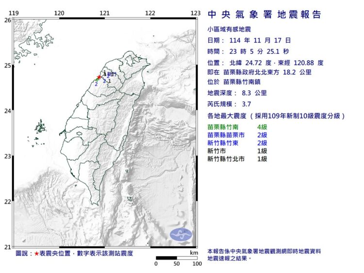 而晚間11點05分的地震震央在苗栗縣政府北北東方 18.2 公里,同樣位於苗栗竹南鎮,地震深度8.3公里