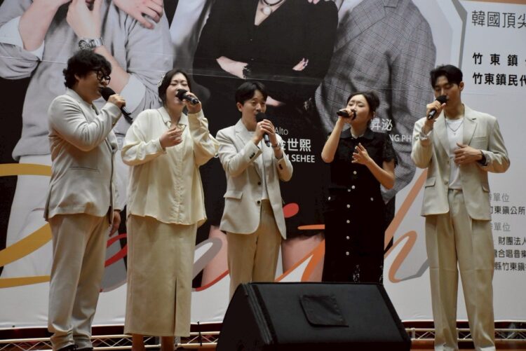 ▲新竹縣竹東鎮公所4月25日在東泰高中舉辦「竹東2025春唱音樂會」,邀請國際知名的Zenith韓國人聲樂團演出,場面氣氛熱鬧。(圖/竹東鎮公所提供)