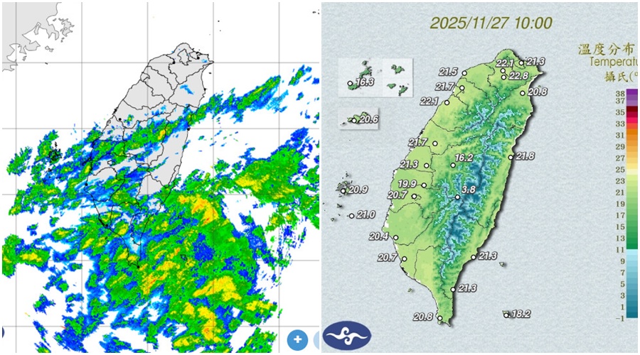 今天11月27日受東北季風影響,北部、東北部及東部天氣較涼,其他地區早晚亦涼;水氣稍有增多,桃園以北、臺灣東半部地區及恆春半島有局部短暫雨,竹苗、南部地區及中部山區有零星短暫雨,其他地區及澎湖、金門、馬祖為多雲的天氣;另因對流雲系發展旺盛,易有短延時強降雨,今天蘭嶼有局部大雨發生的機率。恆春半島沿海易有長浪發生,海邊活動請注意。