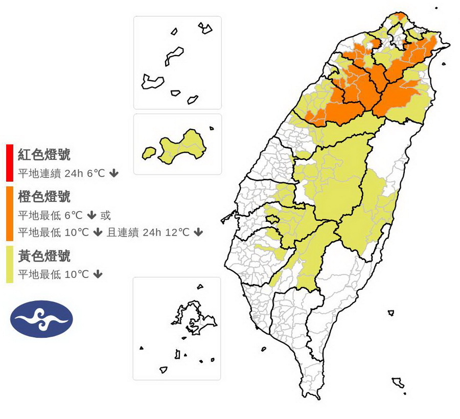 氣象署早上又發出低溫特報,非常寒冷的地區有:新北、臺北、桃園、新竹縣、苗栗、宜蘭等縣市有持續10度左右或以下氣溫發生的機率;寒冷地區有:基隆、新竹市、臺中、彰化、南投、雲林、嘉義市、嘉義縣、臺南、高雄、花蓮、金門等縣市有10度以下氣溫發生的機率,請注意保暖,農作物及水產養殖業慎防寒害。