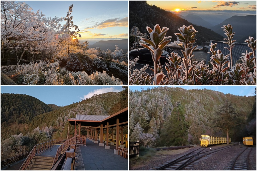 今天1月9日強烈大陸冷氣團稍有減弱,但因輻射冷卻影響,各地早晚仍然寒冷,太平山今天早上氣溫大約 0°C,天氣非常寒冷,但沒有下雪。山區霧氣籠罩,樹梢與枝條再現霧淞,木棧平台出現結霜,樹上淞、地上霜,相映成趣,依然壯麗動人。