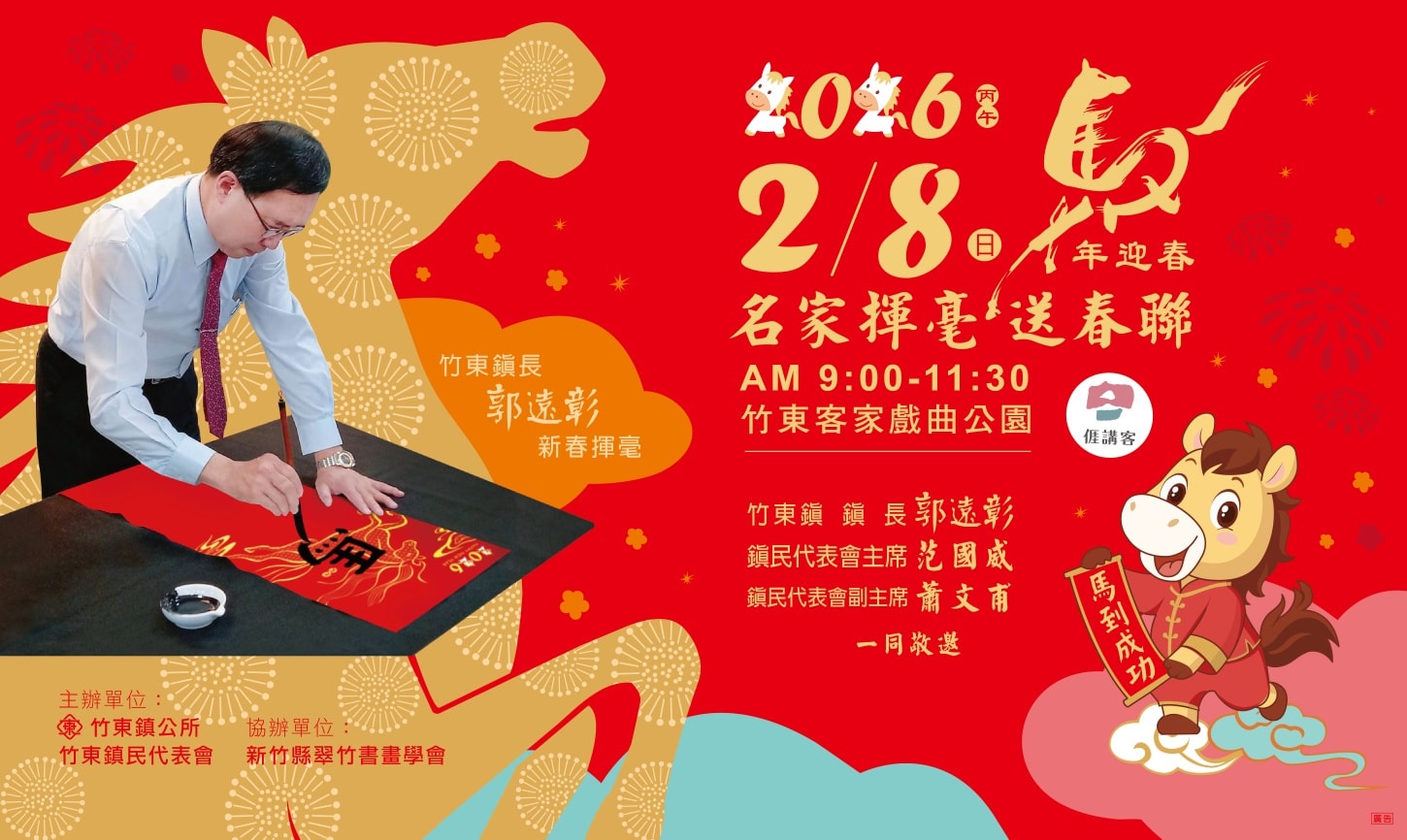 農曆春節腳步將近,新竹縣竹東鎮公所為了讓鄉親感受傳統年節氛圍,將於2月8日(週日)上午,在竹東客家戲曲公園舉辦2026「馬年迎春—名家揮毫送春聯」活動。現場邀請10位書法名家揮毫,重現墨香年味,民眾只要說一句客家話,即可免費領取客製化春聯,限量1000份送完為止。鎮長郭遠彰誠摯邀請鄉親共襄盛舉,提早感受熱鬧溫馨的客家年節氣氛。