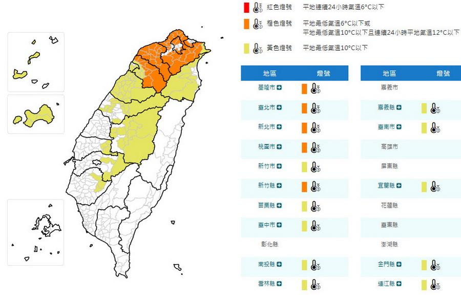 氣象署發布低溫特報顯示,非常寒冷的區域有:新北、基隆、臺北、桃園、新竹縣等縣市;寒冷區域則有:新竹市、苗栗、臺中、南投、雲林、嘉義、臺南、宜蘭、金門等縣市,連江縣甚至有6度以下低溫的機率。請注意保暖,農漁業慎防寒害。